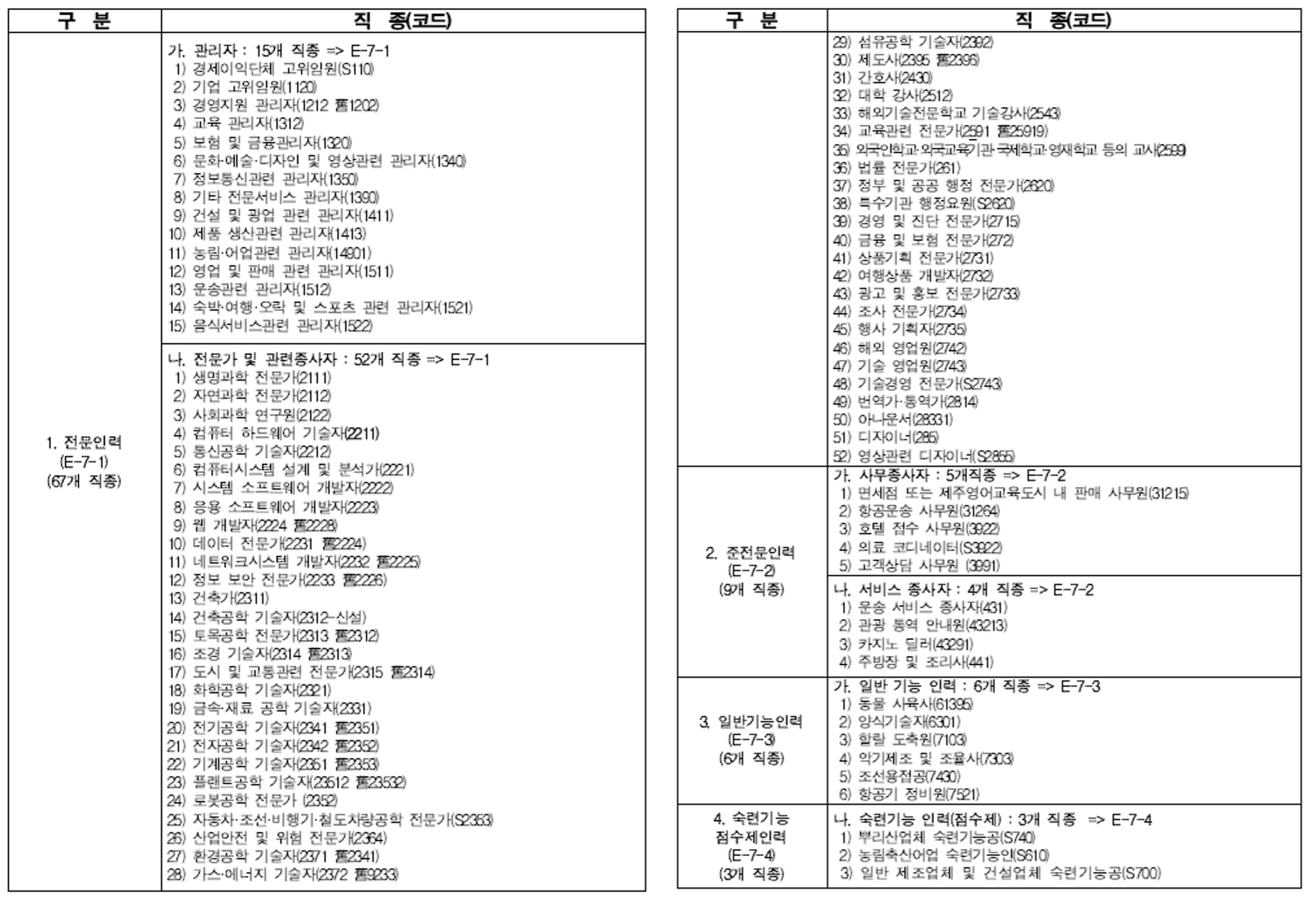 외국인 E-7 비자 도입직종